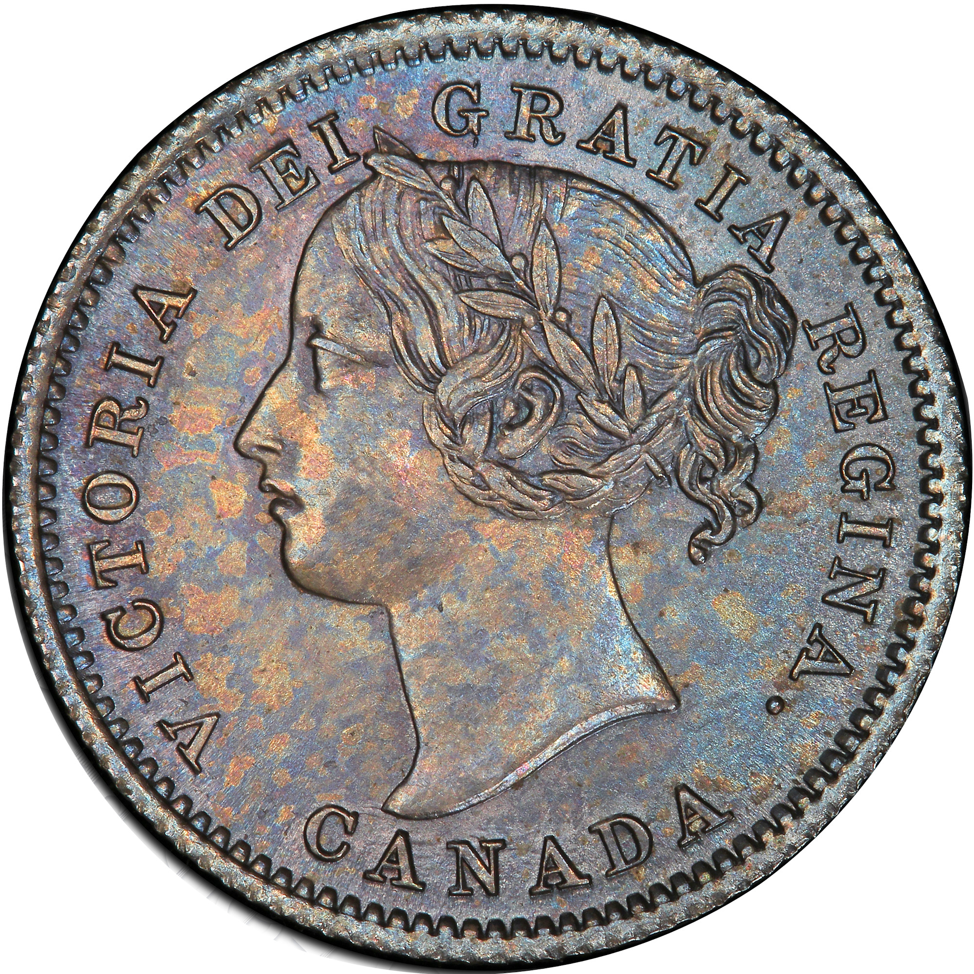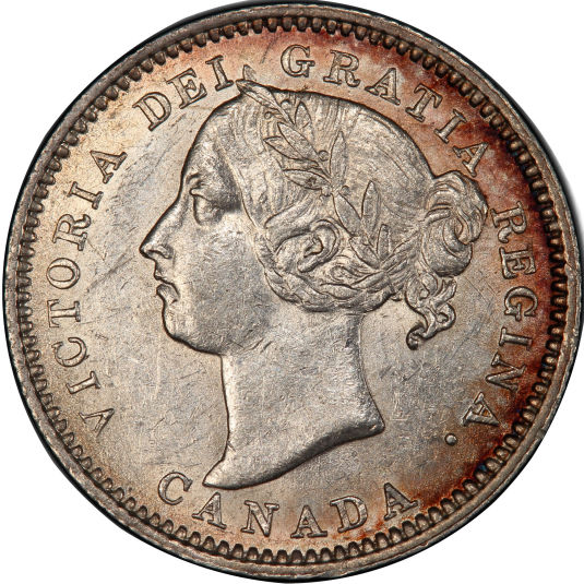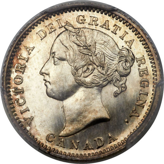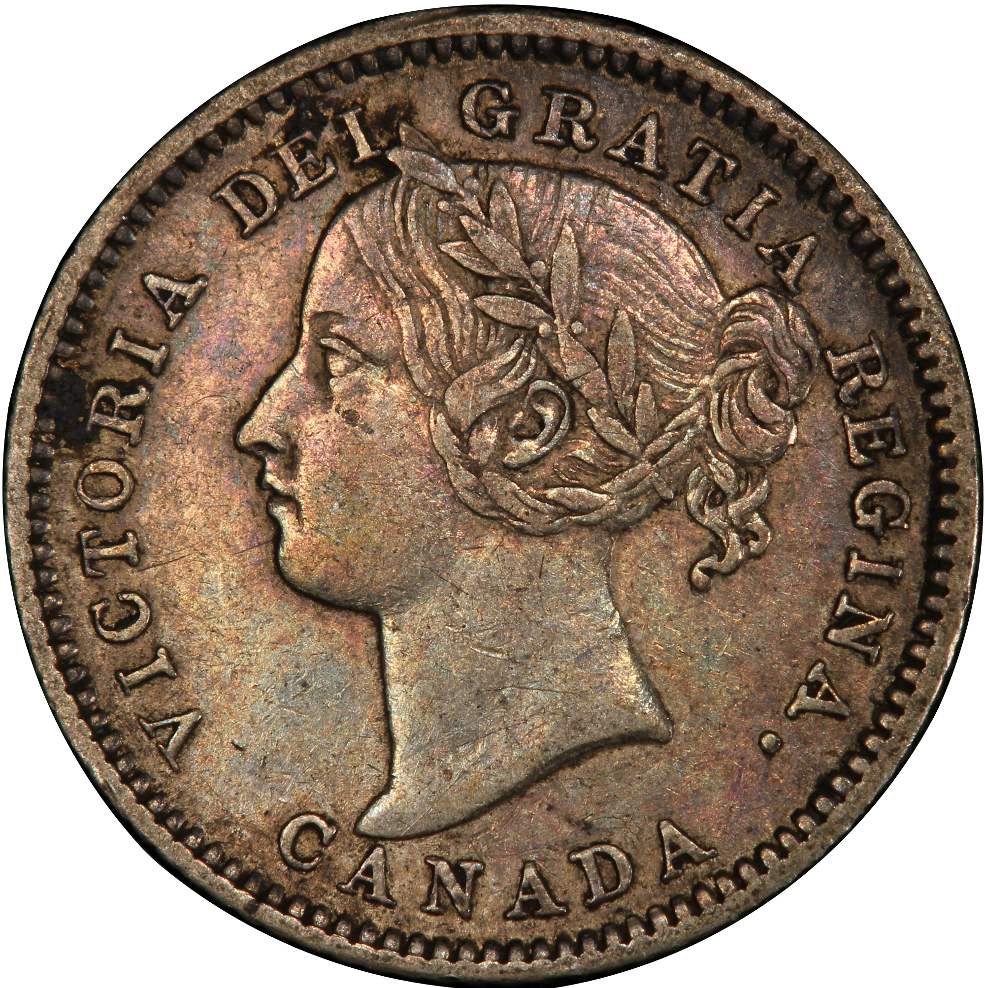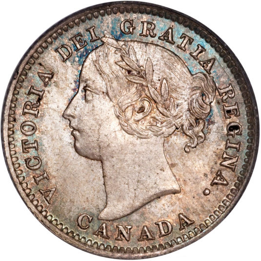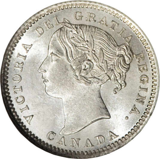 Designed by Leonard C. Wyon, the portrait in left profile of Victoria is surrounded with the inscriptions "CANADA" and "VICTORIA DEI GRATIA REGINA" (Victoria, Queen by the grace of God) Victorian Obverse known as "OT1". The acronym is explained as follows: O = Obverse T = Ten cent 1 = Variant Type 1 |