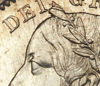 with the inscription "ELIZABETH II D.G.REGINA" (Elizabeth II, Queen by the grace of God). In 1979 the obverse design was modified to use a smaller portrait of the Queen. The reason was to make the portrait more proportional to the coin for every denomination. The easiest way to tell a modified tiara from an original is to look at the distance between the forward point of the lower bust and the rim dots, and the distance between the forward upper jewels on the tiara and the rim dots. In addition, the rim dots are further from the edge than they are on the 1965-1978 obverse. |