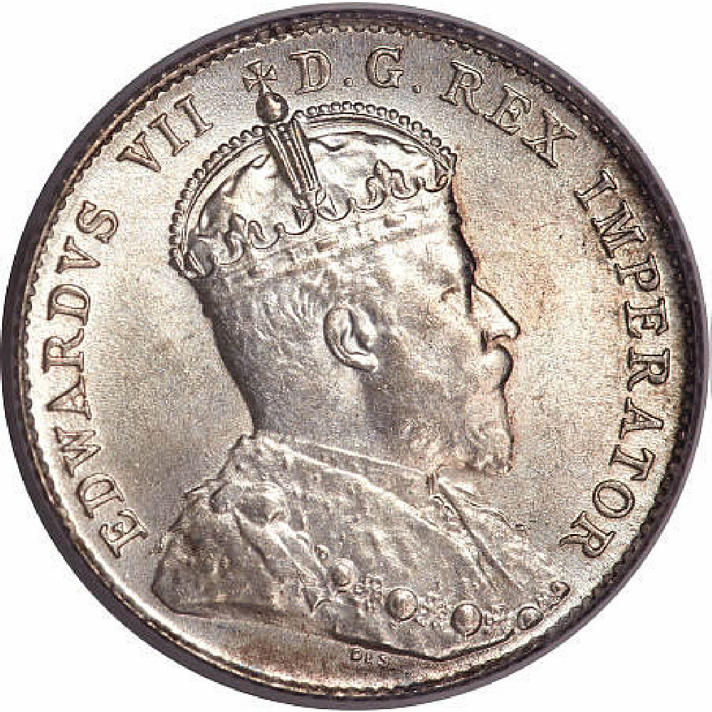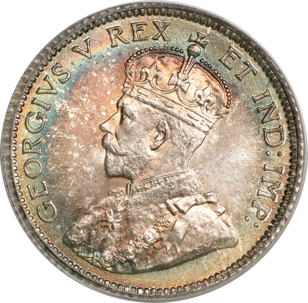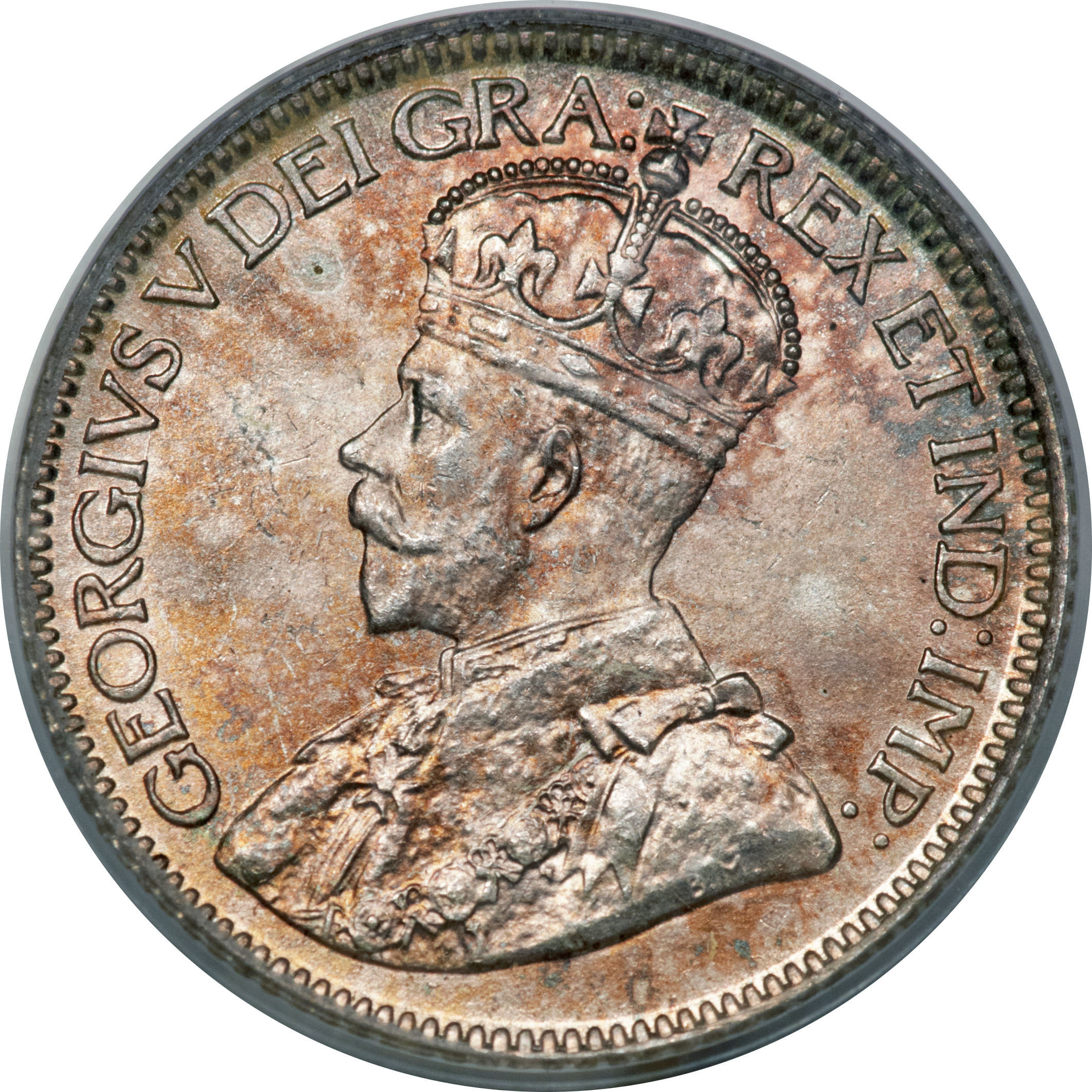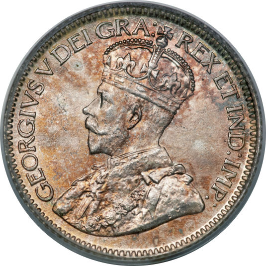 After the death of Edward VII, the coronation of George V in 1910 and the addition of India to the British Empire, a new obverse featuring King George V wearing the Imperal State Crown, surrounded by "GEORGVS V REX ET IND:IMP:" (George V King And Emperor of India) was designed by Sir E. B. MacKennal in 1911. To make room for the abbreviation "ET IND:IMP:" the words "D. G." (By the grace of God) and "IMPERATOR" from the previous obverse design were removed. |