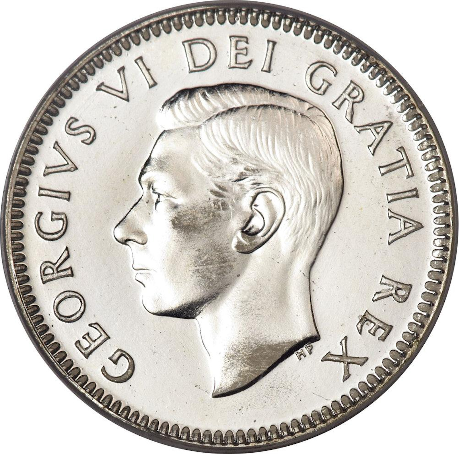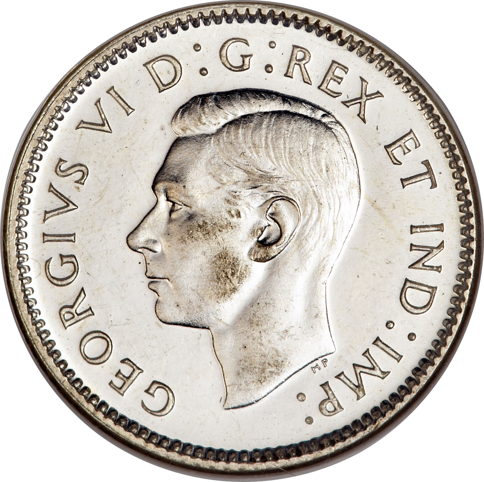 In 1948, India was granted independence from the British Empire. Because of this, the words "ET IND IMP" had to be removed from the obverse of all coin dies. Delays in the manufacturing of the new dies meant that a short term solution had to be found in order to produce the 1948 coins. A new production run was started using the 1947 dies, but to differentiate between the regular issue 1947 coins and the 1948 replacement coins, a Maple Leaf was added to the right of the date on all 1947 reverse dies. The corrected 1948 dies were not received until late in the year. For this reason very few 1948 coins were struck. Designed by Sir T. H. Paget, the portrait in left profile of George VI is surrounded with the inscription "GEORGIVS VI DEI GRATIA REX" (George VI, by the grace of God, King) |