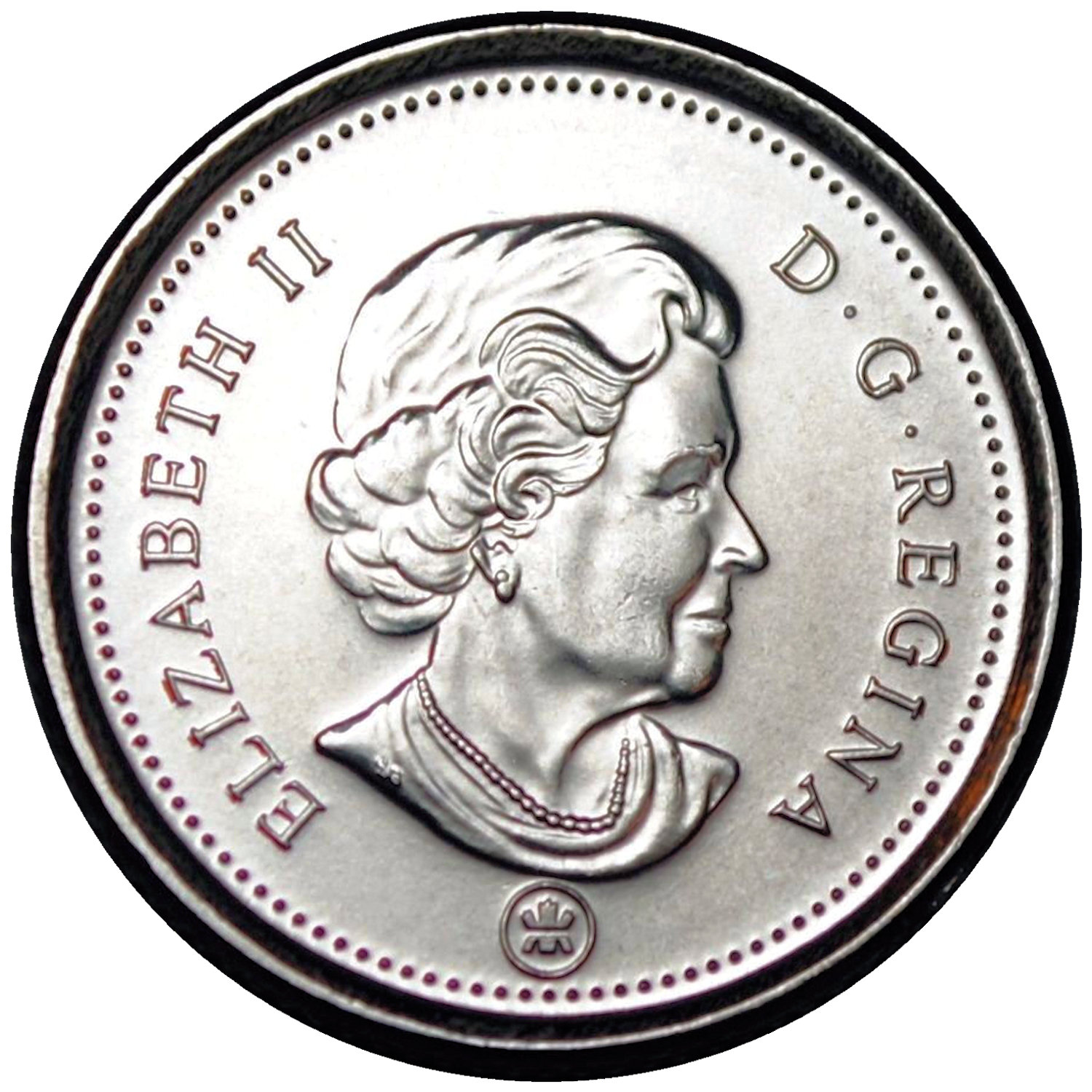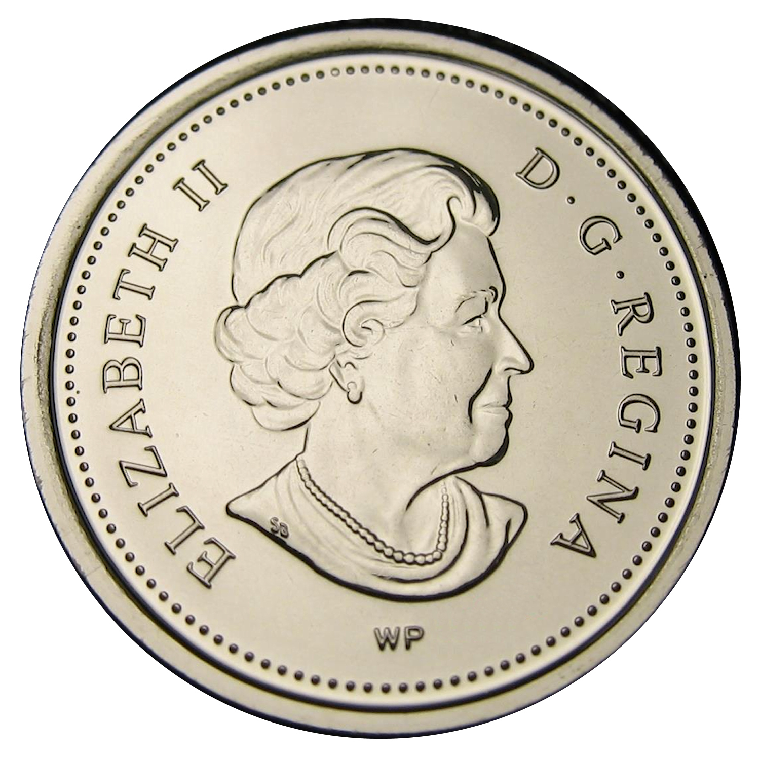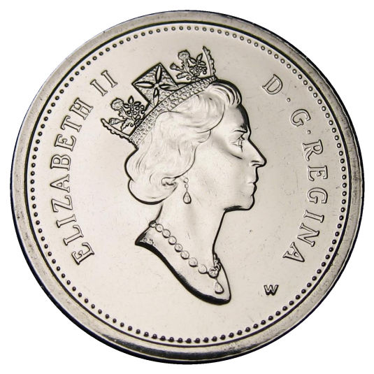 "ELIZABETH II D.G.REGINA" (Elizabeth II, Queen by the grace of God). These coins were minted at the Winnipeg branch of the Royal Canadian Mint, and are differentiated from the regular issue by the addition of a "W" mint mark to the lower right of the Queen's effigy. |