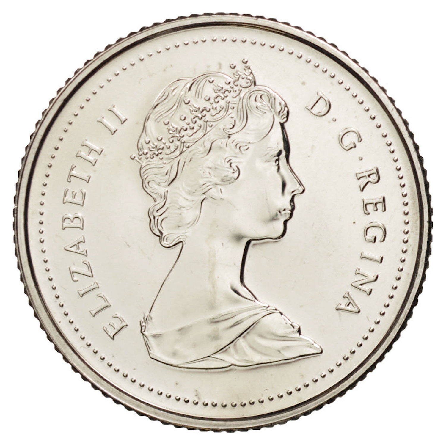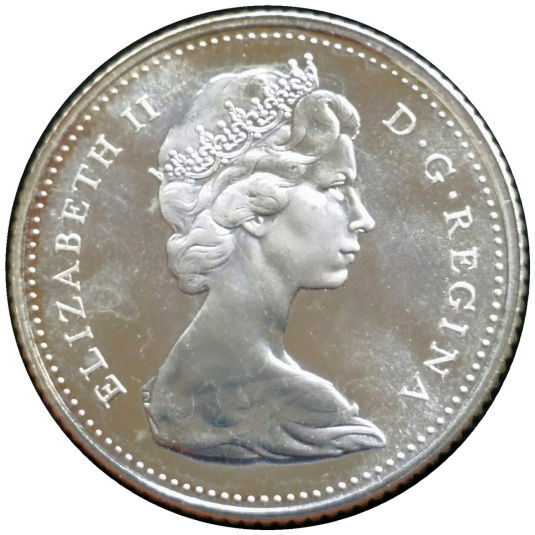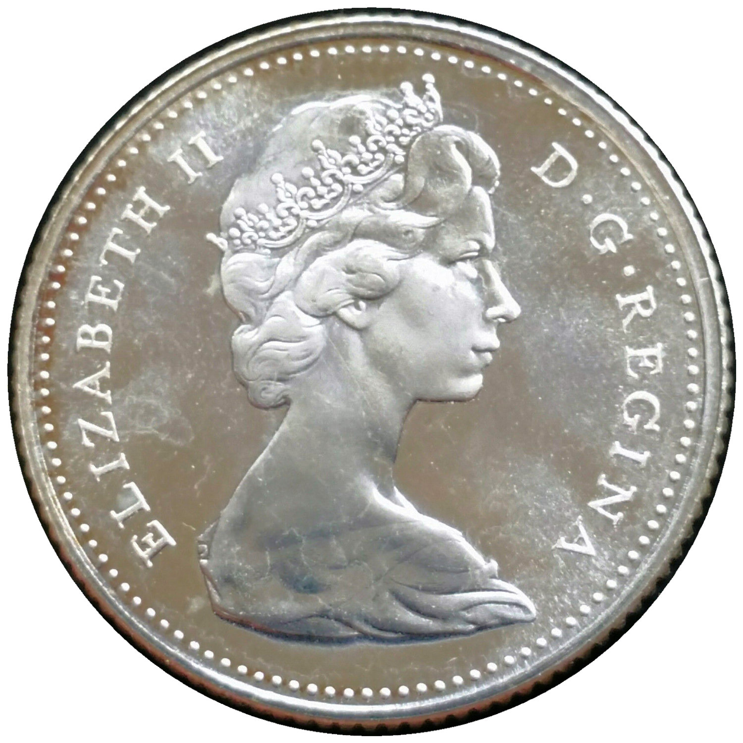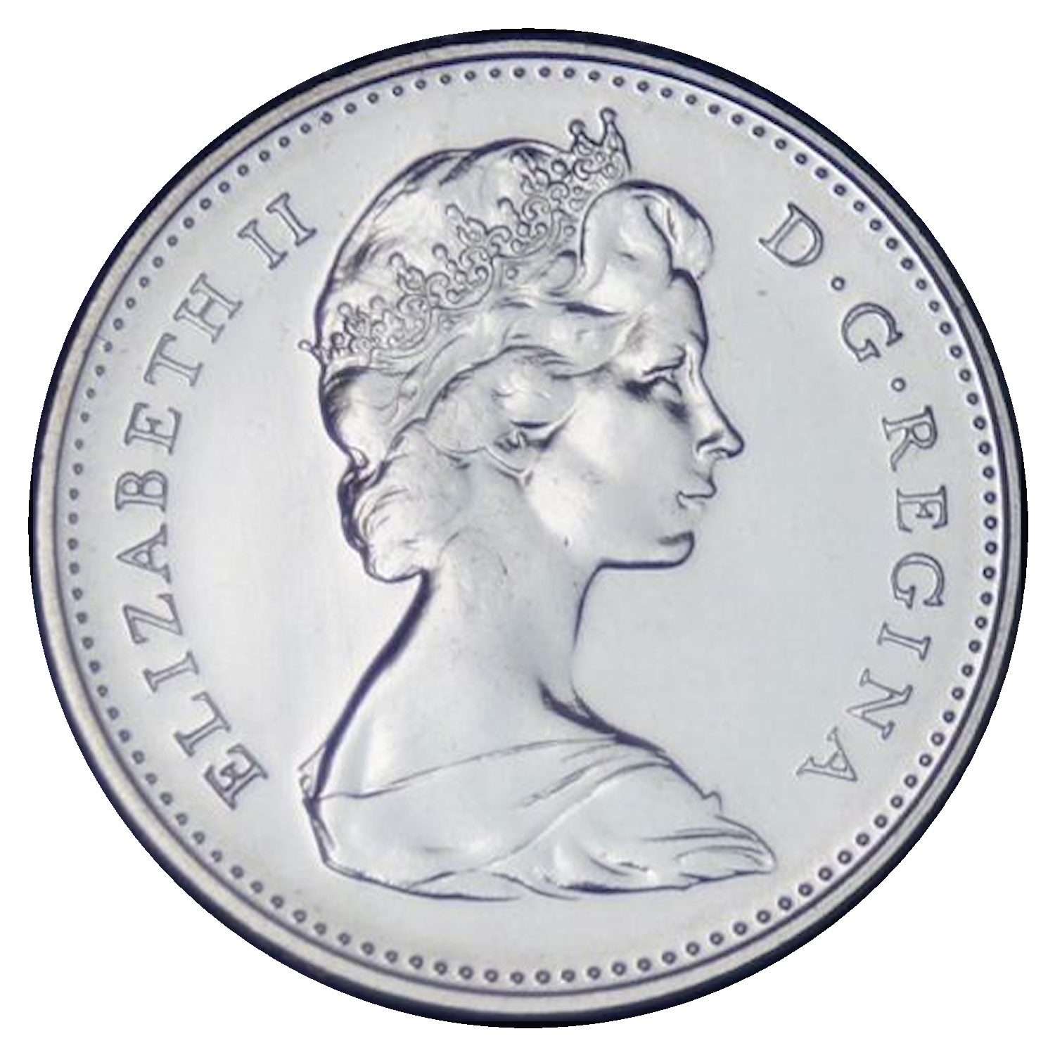 "ELIZABETH II D.G.REGINA" (Elizabeth II, Queen by the grace of God). These coins were minted at the Winnipeg branch of the Royal Canadian Mint, and are differentiated from the regular issue by the addition of a "W" mint mark to the lower right of the Queen's effigy. |