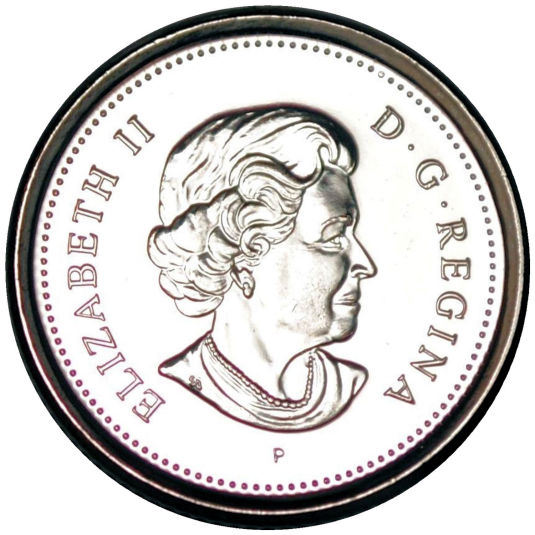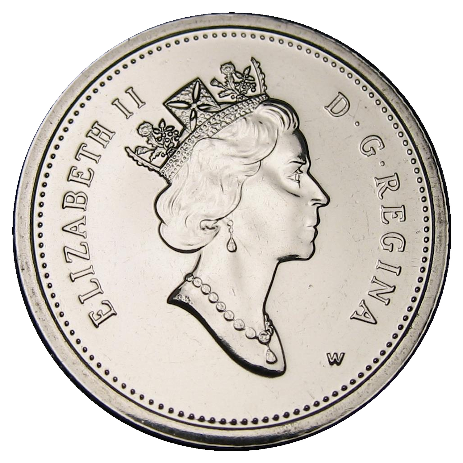 The same effigy of Queen Elizabeth II introduced in 1990 was continued. Starting in 1999, the Mint began experimenting with the use of multi-ply steel material instead of nickel alloys. This process starts with a steel core, then adds layers by electroplating nickel, then copper and finally nickel to the core. All coins which were plated in this way have a "P" composition mark on the obverse side of the coins. The same obverse design used from 1990-2001 was repeated with these plated coins. Although limited copies were manufactured this way in 1999 and 2000, the process did not make it's way into full production for circulation until the 2001 production year. |
