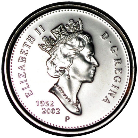 Elizabeth Coronation Anniversary Designed by Dora de Pedry-Hunt, this coin was issued in honour of the the golden anniversary of Queen Elizabeth II's coronation. The date was moved to the obverse side and altered to read "1952 2002". Again, the "P" composition mark is used to denote the use of multi-ply plated steel blank planchets. |