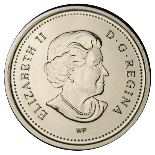 "ELIZABETH II D.G.REGINA" (Elizabeth II, Queen by the grace of God) and the "P" composition mark is in place below the effigy. These coins were produced at the Winnipeg branch of the RCM and as such bear the "W" mint mark. |