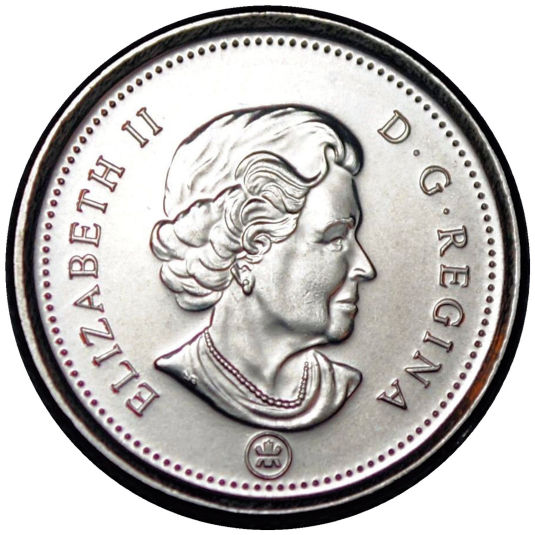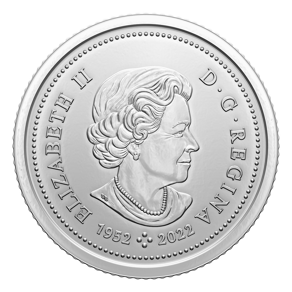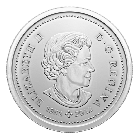 After the death of Queen Elizabeth II on September 8 2022, the Royal Canadian Mint changed the obverses of all 2023 coins. They added four pearls below her effigy, symbolizing the four effigies of Her Majesty that have graced Canadian coins since her coronation in 1953. The pearls are flanked by the dates "1952" and "2022" which signify the years she reigned over the United Kingdom. |