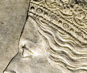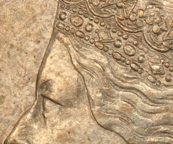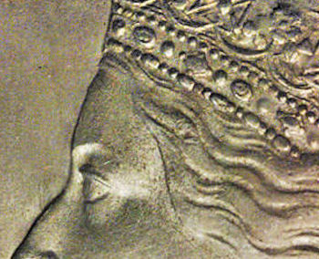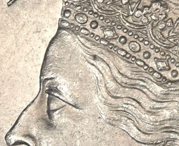 For the obverse side, Arnold Machin used a smaller, more detailed effigy of the Queen, and fewer rim beads placed farther from the rim.