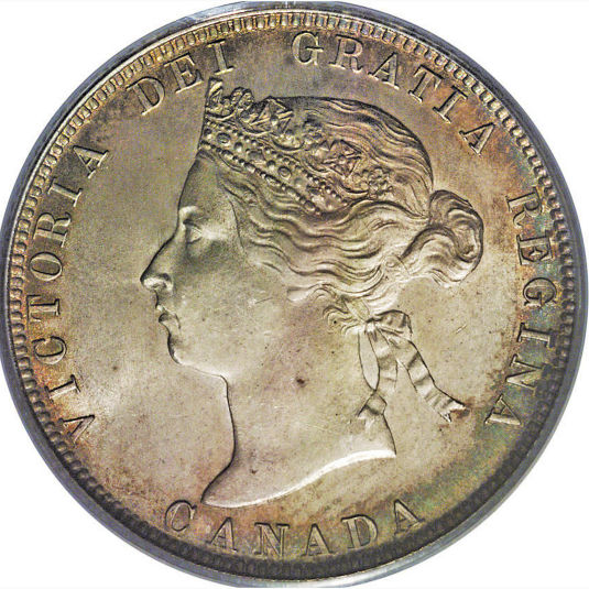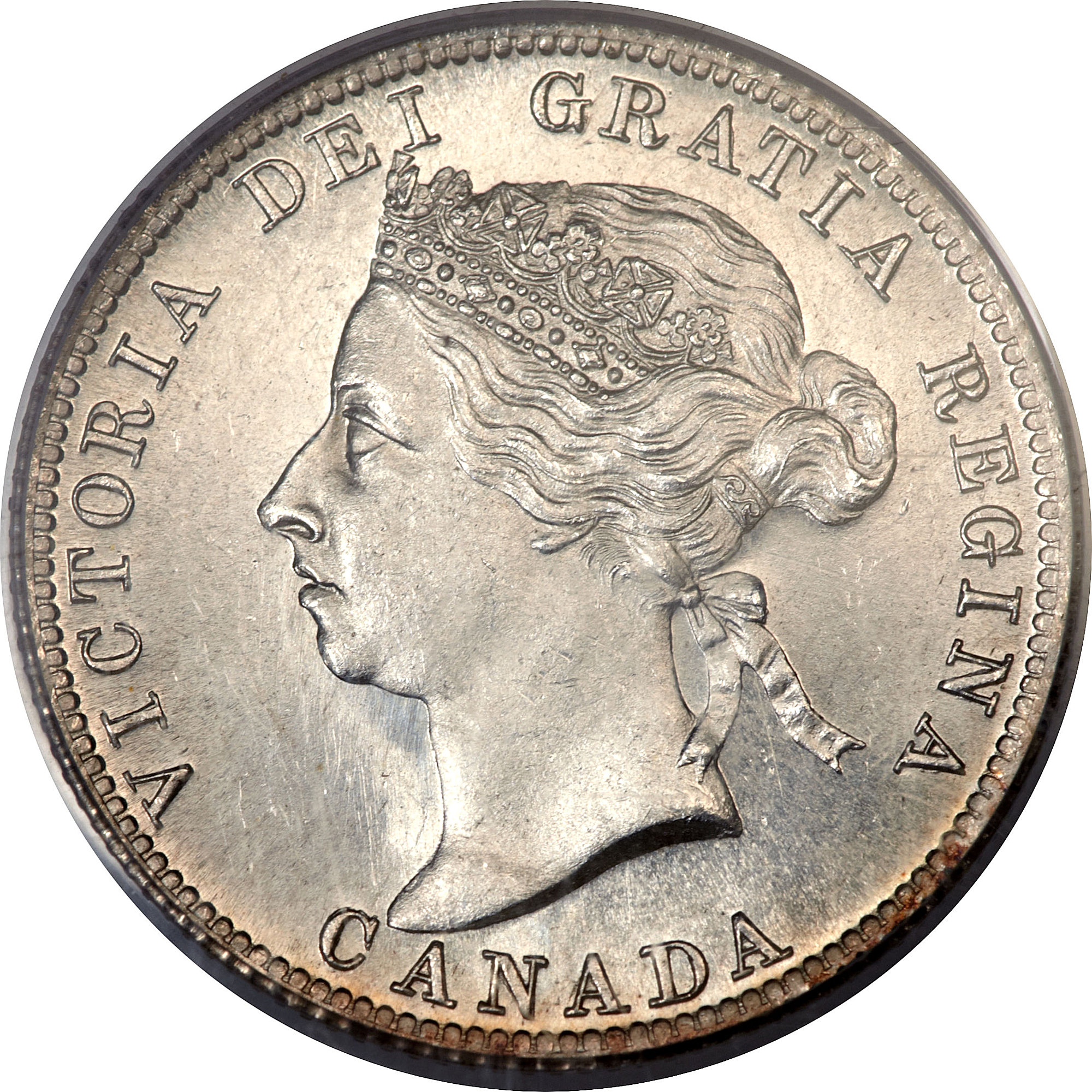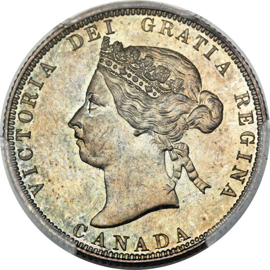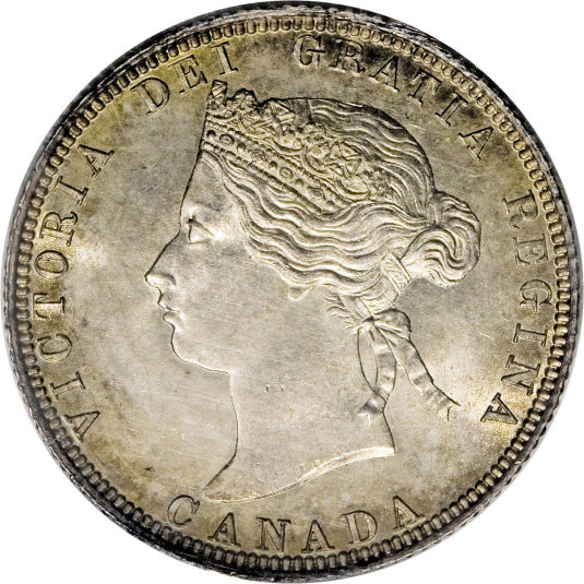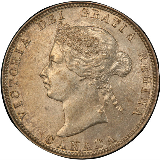 Victorian Obverse known as "OQ1". The acronym is explained as follows: O = Obverse Q = Quarter 1 = Variant Type 1 The portrait in left profile of Victoria is surrounded with the inscriptions "CANADA" and "VICTORIA DEI GRATIA REGINA" (Victoria, Queen by the grace of God) Lettering: VICTORIA DEI GRATIA REGINA. CANADA Engraver: Leonard Charles Wyon Note: The basic layout and content is the same for all varieties of Victorian obverse, however there are subtle but noticeable differences between them. These differences are generally found in the following areas: - The hairline between the brow and the crown - The upper and lower eyelids - The curl of the upper lip, and the detail in the corner of the mouth - The degree of doubling of the chin - The shape and centering of the V in the hair ribbons |