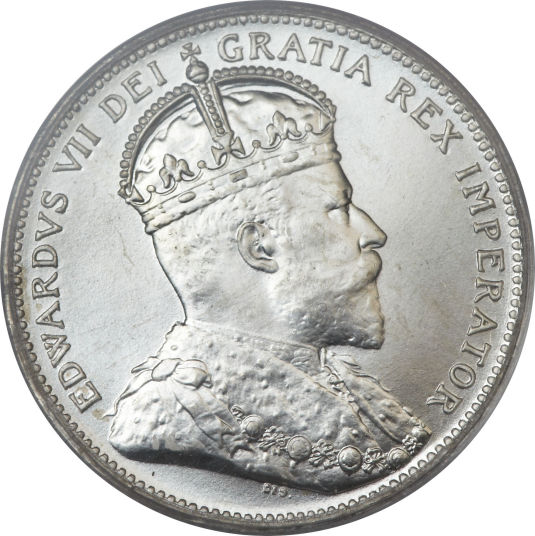 After the death of Queen Victoria in January of 1901, a new effigy was designed featuring King Edward VII. The portrait in right profile of Edward VII wearing the Imperial State Crown is surrounded with the inscription "EDWARDVS VII DEI GRATIA REX IMPERATOR" (Edward VII, by the grace of God King and Emperor) Lettering: EDWARDVS VII DEI GRATIA REX IMPERATOR Engraver: George William de Saulles The designer's signature (DES) can be found below the truncation King's effigy, towards the front of the chest. |