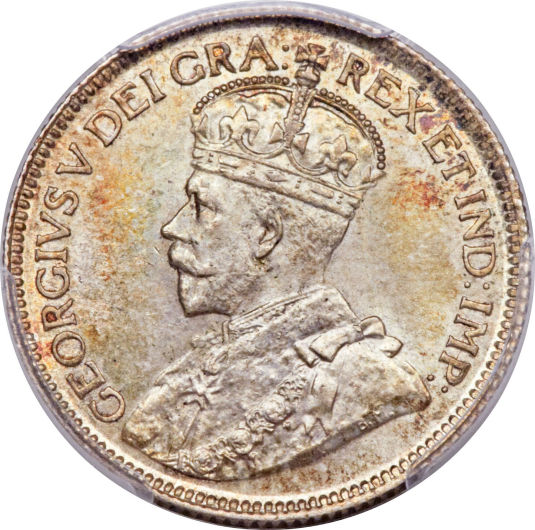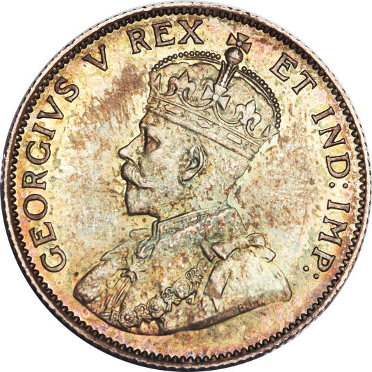 After the death of Edward VII, the coronation of George V in 1910 and the addition of India to the British Empire, a new obverse featuring King George V wearing the Imperal State Crown, surrounded by "GEORGVS V REX ET IND:IMP:" (George V King And Emperor of India) was designed by Sir E. B. MacKennal in 1911. To make room for the abbreviation "ET IND:IMP:" the words "D. G." (By the grace of God) and "IMPERATOR" from the previous obverse design were removed. |