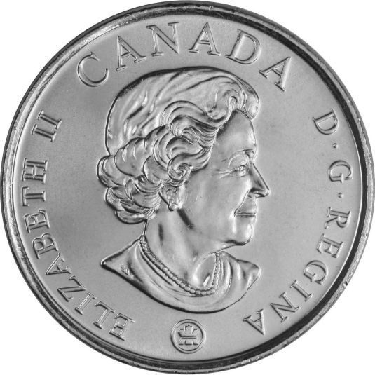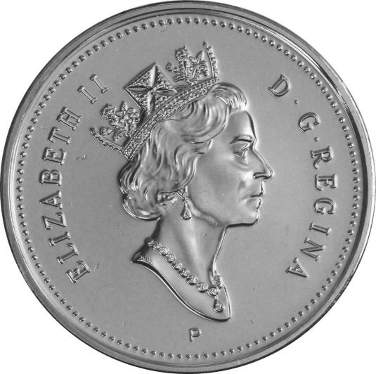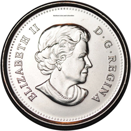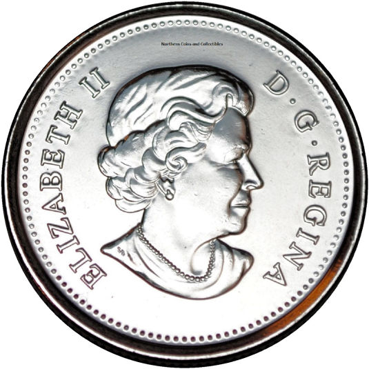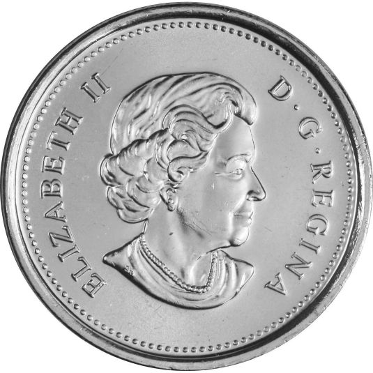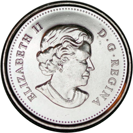 The portrait in right profile of Elizabeth II, when she was 77 years old, is surrounded with the inscription "ELIZABETH II D . G . REGINA" (Elizabeth II, Queen by the grace of God). Lettering: ELIZABETH II D . G . REGINA P Engraver: Susanna Blunt During the 2003 production run the obverse was changed to feature a new, more mature looking effigy of Queen Elizabeth II, designed by Susanna Blunt and Susan Taylor. Other coins which use this obverse design include: In 2004, two commemorative coins were produced: - The first celebrates the establishment of the first year-round settlement in Canada, on the island of St. Croix, by Pierre Dugua, Sieur de Mons and Samuel de Champlain. - The second coin was released to commemorate Remembrance Day, and was the first coloured circulation coin issed in Canada. In 2005, three commemorative coins were produced: - The first celebrates the 100th anniversary of the incorporation of Alberta as a province. - The second celebrates the 100th anniversary of the incorporation of Saskatchewan as a province. - The third coin was released to celebrate the Year of the Veteran. |