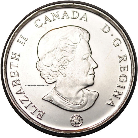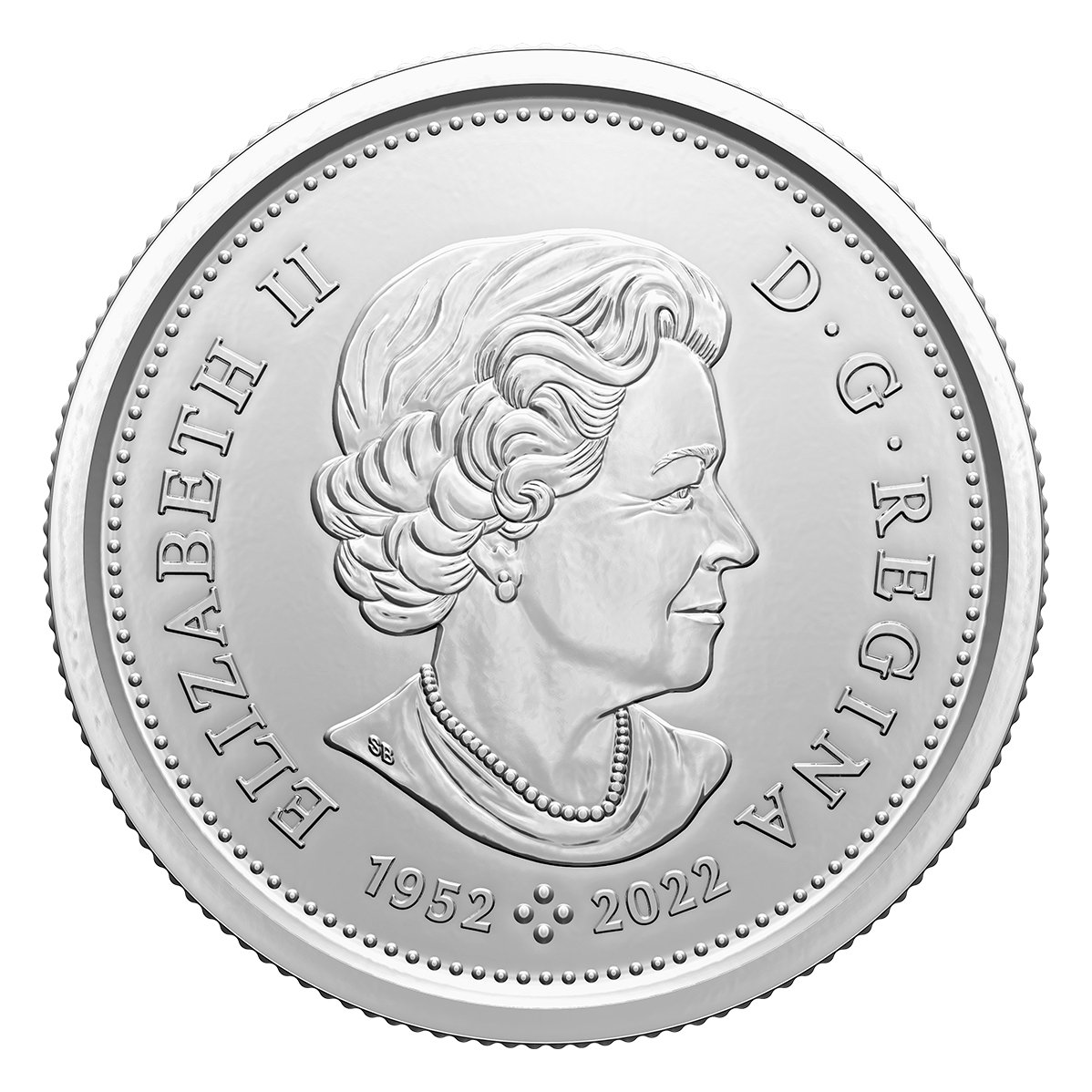 After the death of Queen Elizabeth II on September 8 2022, the Royal Canadian Mint changed the obverses of all 2023 coins. They added four pearls below her effigy, symbolizing the four effigies of Her Majesty that have graced Canadian coins since her coronation in 1953. The pearls are flanked by the dates "1952" and "2022" which signify the years she reigned over the United Kingdom. |