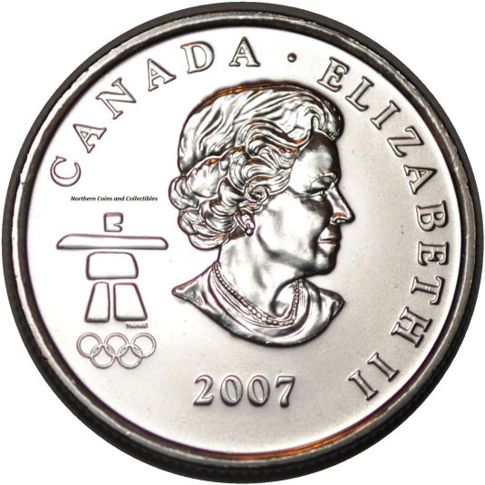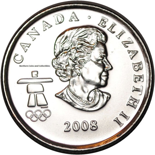 Starting in 2007 a series of 25 cent coins were designed to celebrate the Winter Olympics, which were to be hosted by Vancouver, British Columbia. The date and the word "CANADA"