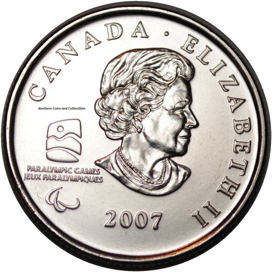 additions, the effigy of Queen Elizabeth II was dramatically reduced in size. While four different reverse designs were released in 2007, they all shared the same obverse. In addition to the regular Winter Olympic sports that were immortalized, another coin was designed to celebrate the 2010 Winter Paralympic Games, also hosted by Vancouver B.C. The obverse of the Paralympic Wheelchair Curling coin was the same as the regular Olympic obverse, but the Olympic logo was replaced by the 2010 Paralympic logo. |