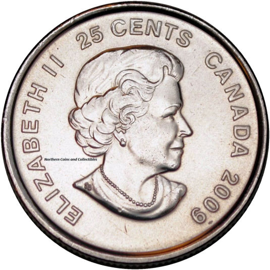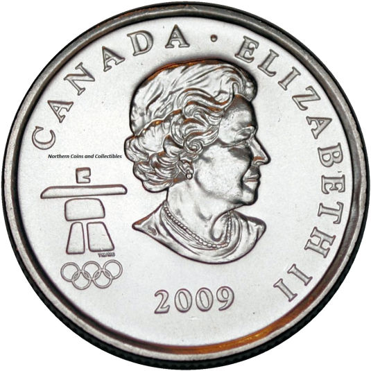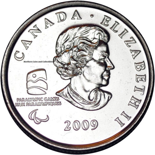 In 2009 the Olympic 25 cent series of coins was continued. While four different reverse designs were released in 2009, they all shared the same obverse as the 2007 and 2008 releases, with the exception of the changed date. In addition to the regular Winter Olympic sports that were immortalized, another coin was designed to celebrate the 2010 Winter Paralympic Games, also hosted by Vancouver B.C. The obverse of the Paralympic Ice Sledge Hockey coin was the same as the regular Olympic obverse, but the Olympic logo was replaced by the 2010 Paralympic logo. |