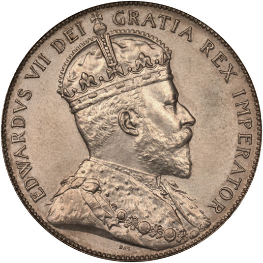 After the death of Queen Victoria in January of 1901, a new effigy was designed by George W. Desaulles featuring King Edward VII wearing the Imperial State Crown, looking towards the right of the coin. The rim of the coin contains the words "EDWARDVS VII DEI GRATIA REX IMPERATOR" which translates to "Edward VII By The Grace Of God King And Emperor". The designer's signature (DES) can be found below the truncation King's effigy, towards the front of the chest. |