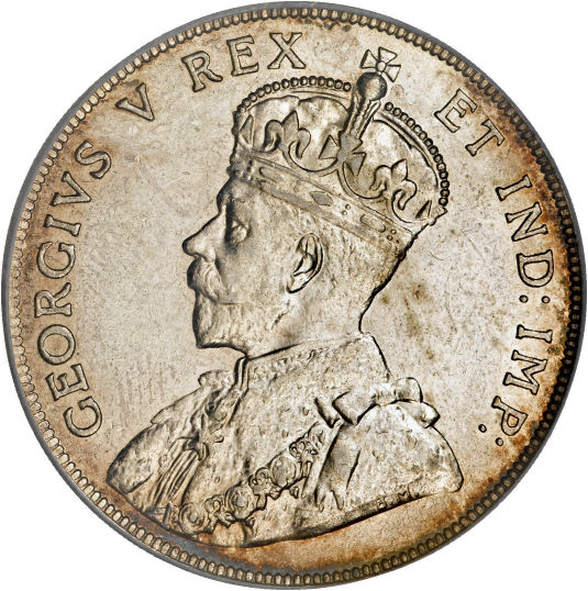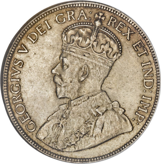 After the death of Edward VII, the coronation of George V in 1910 and the addition of India to the British Empire, a new obverse featuring King George V wearing the Imperal State Crown, surrounded by "GEORGIVS V REX ET IND:IMP:" (George V King And Emperor of India) was designed by Sir E. B. MacKennal in 1911. To make room for the abbreviation "ET IND:IMP:" the words "D. G." (By the grace of God) and "IMPERATOR" from the previous obverse design were removed. |
