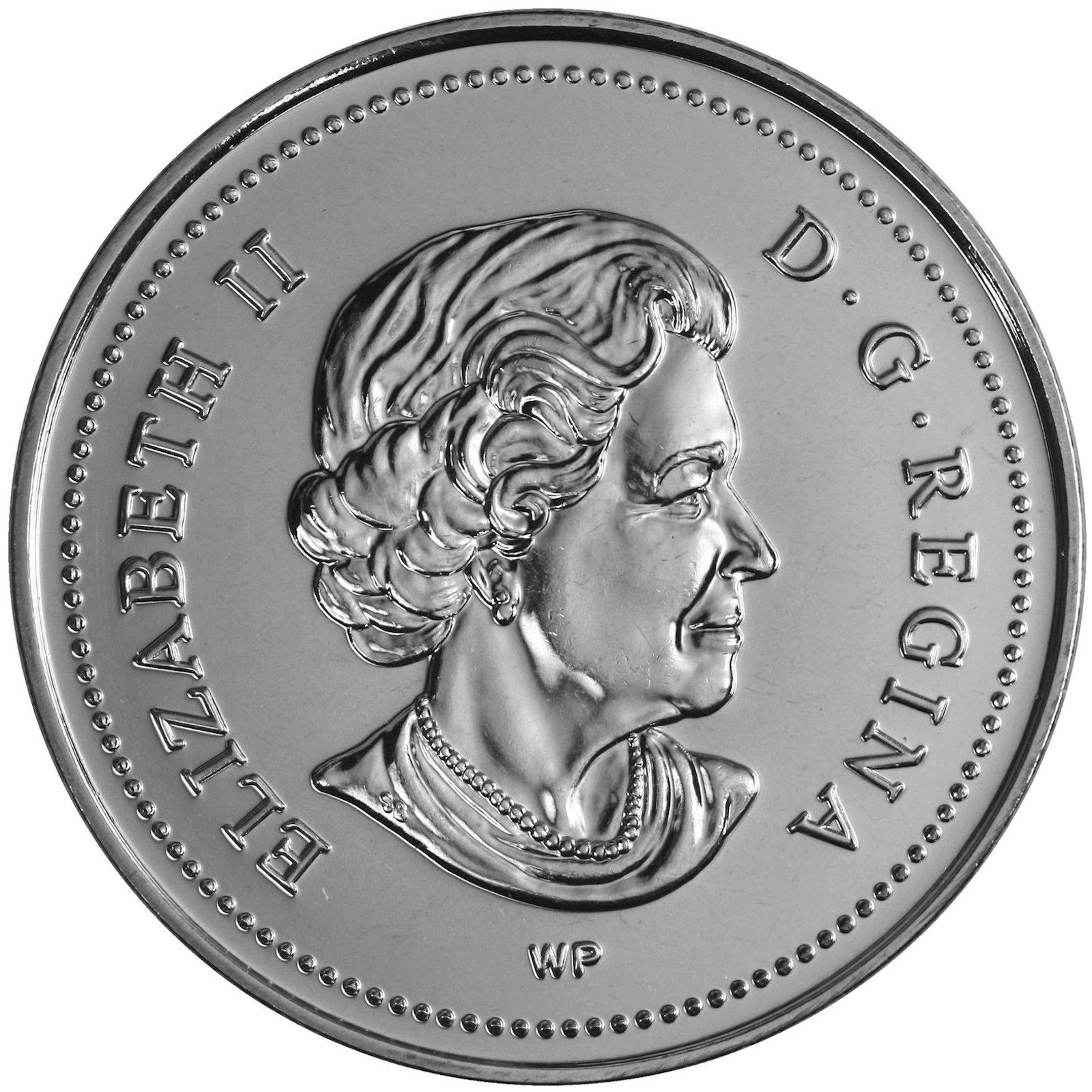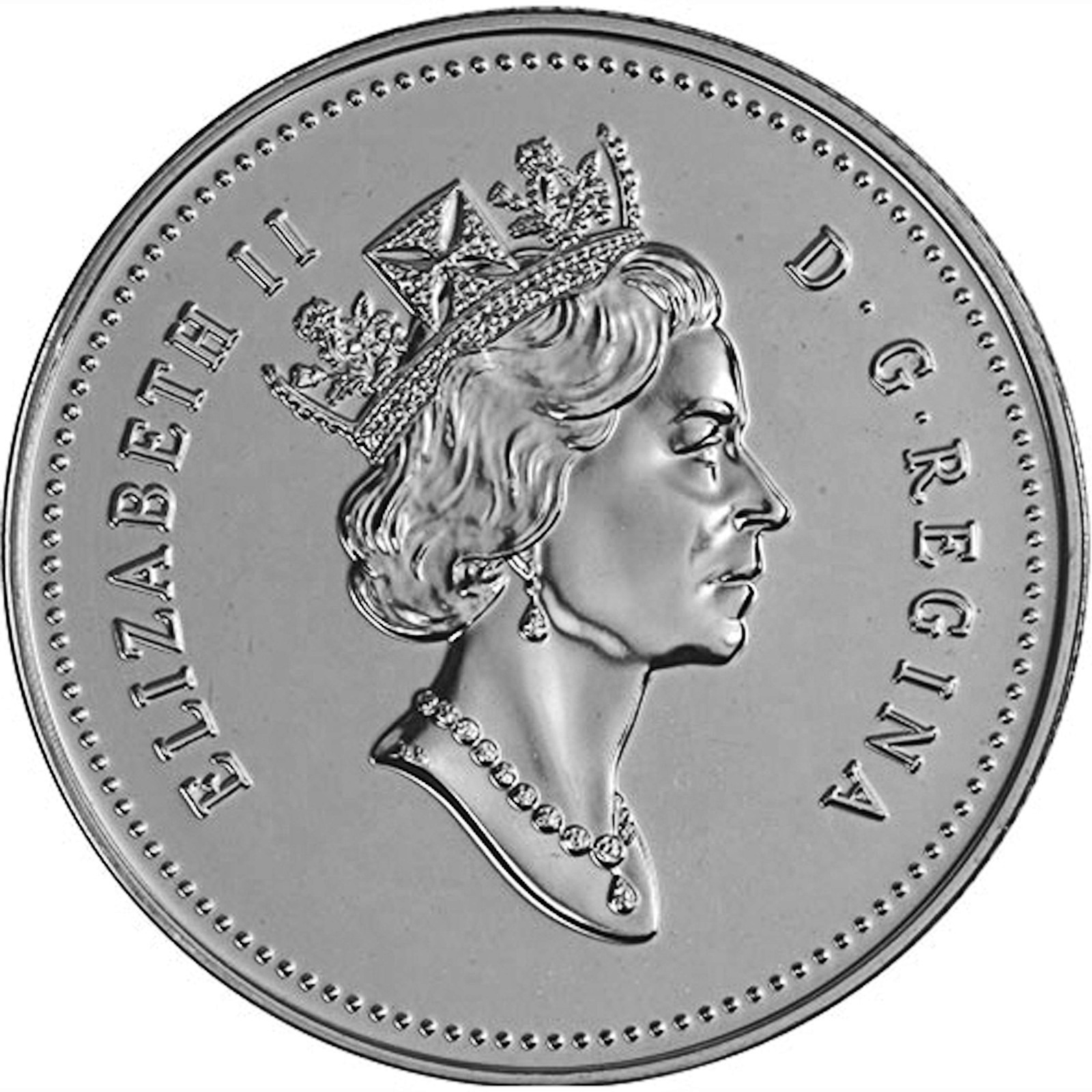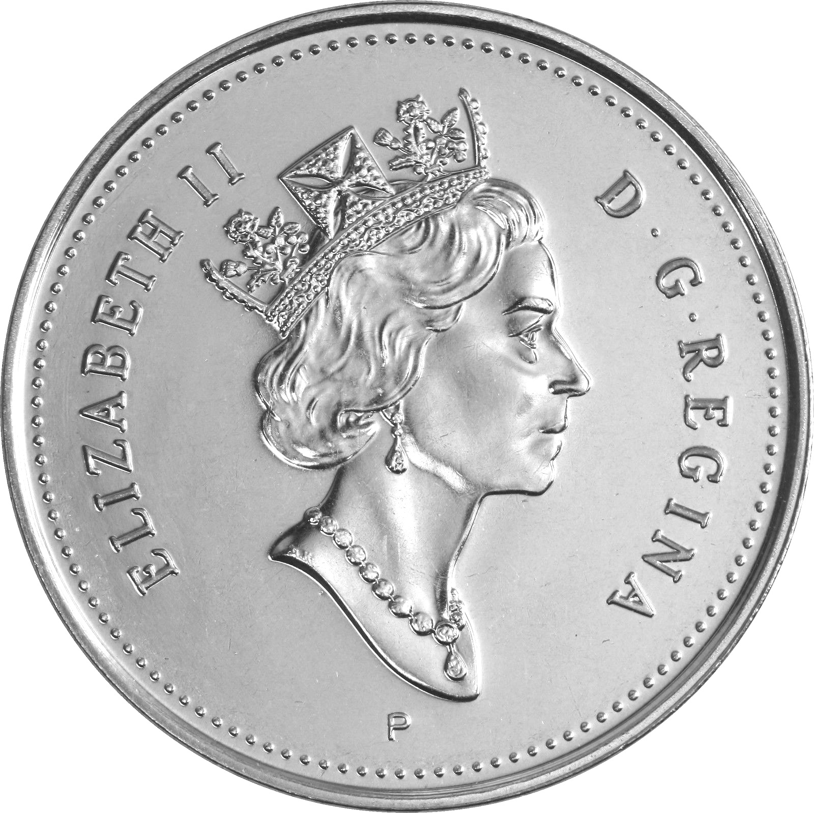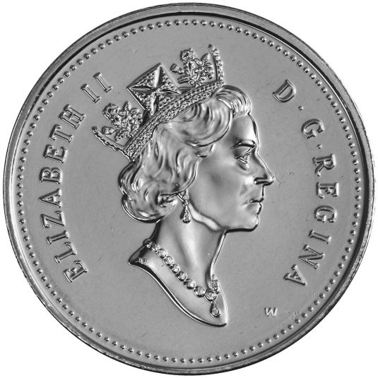 Elizabeth II Diadem (Winnipeg Mint) A new obverse designed by Dora de Pedry-Hunt and Ago Aarand was created in 1990 showing the Queen wearing a diamond diadem and jewellery. 1998 and 2000 coins which were minted at the Winnipeg branch of the RCM have a "W" mint mark below the Queen's effigy. |