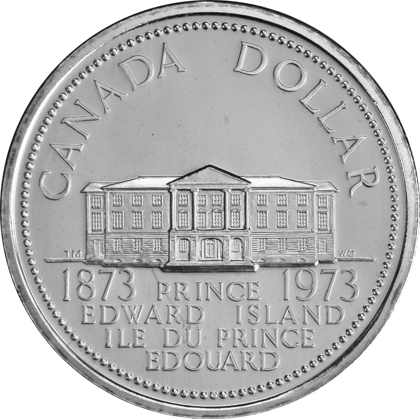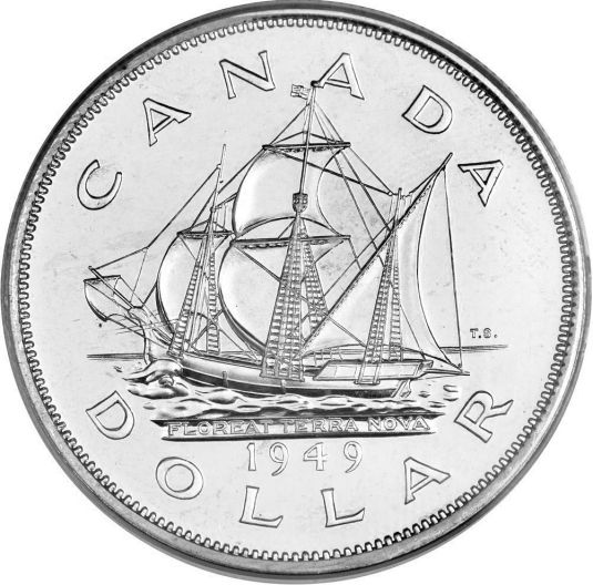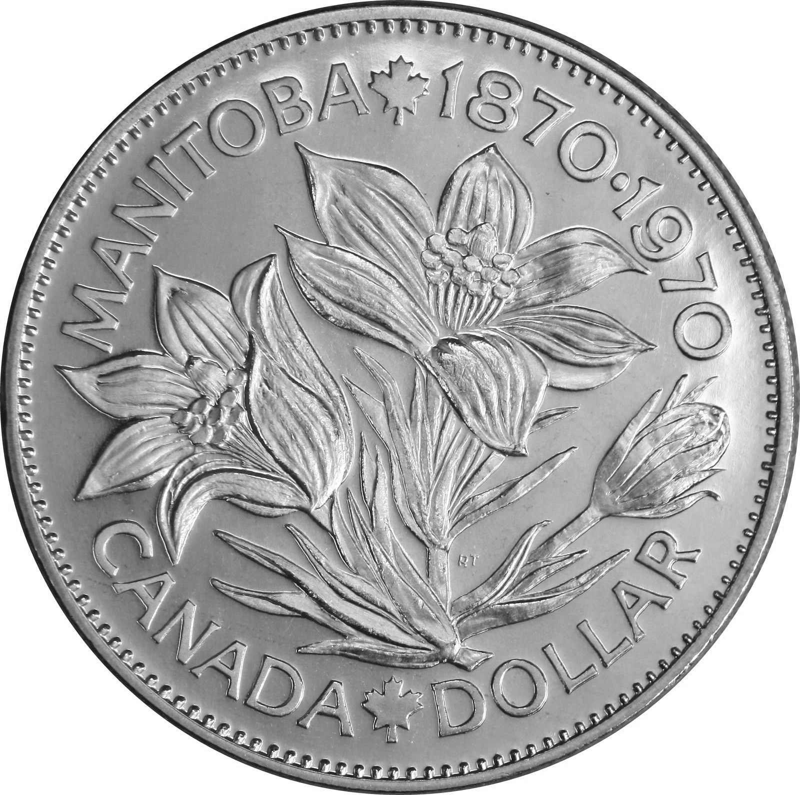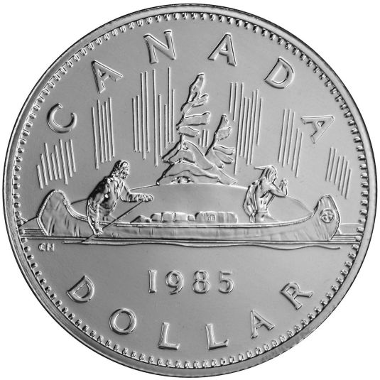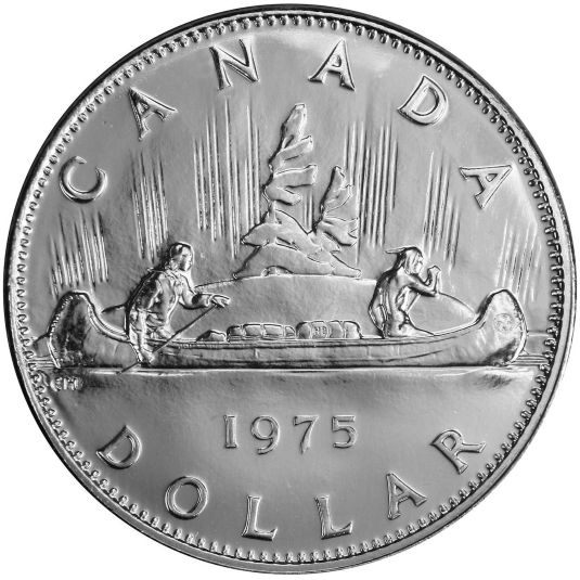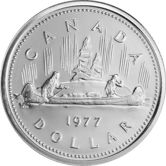 The Voyageur This design by Emanuel Hahn features a voyageur and an aboriginal travelling by canoe. The front-most bundle depicted on the coin bears the initials "H.B." for Hudson's Bay Company. The decision was made in 1968 to end the use of silver alloys in favour of pure nickel. To make the new nickel coins easier to strike, the 1 dollar coins were reduced in diameter (from 36.00mm to 32.13mm). |