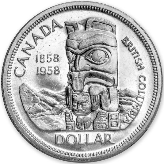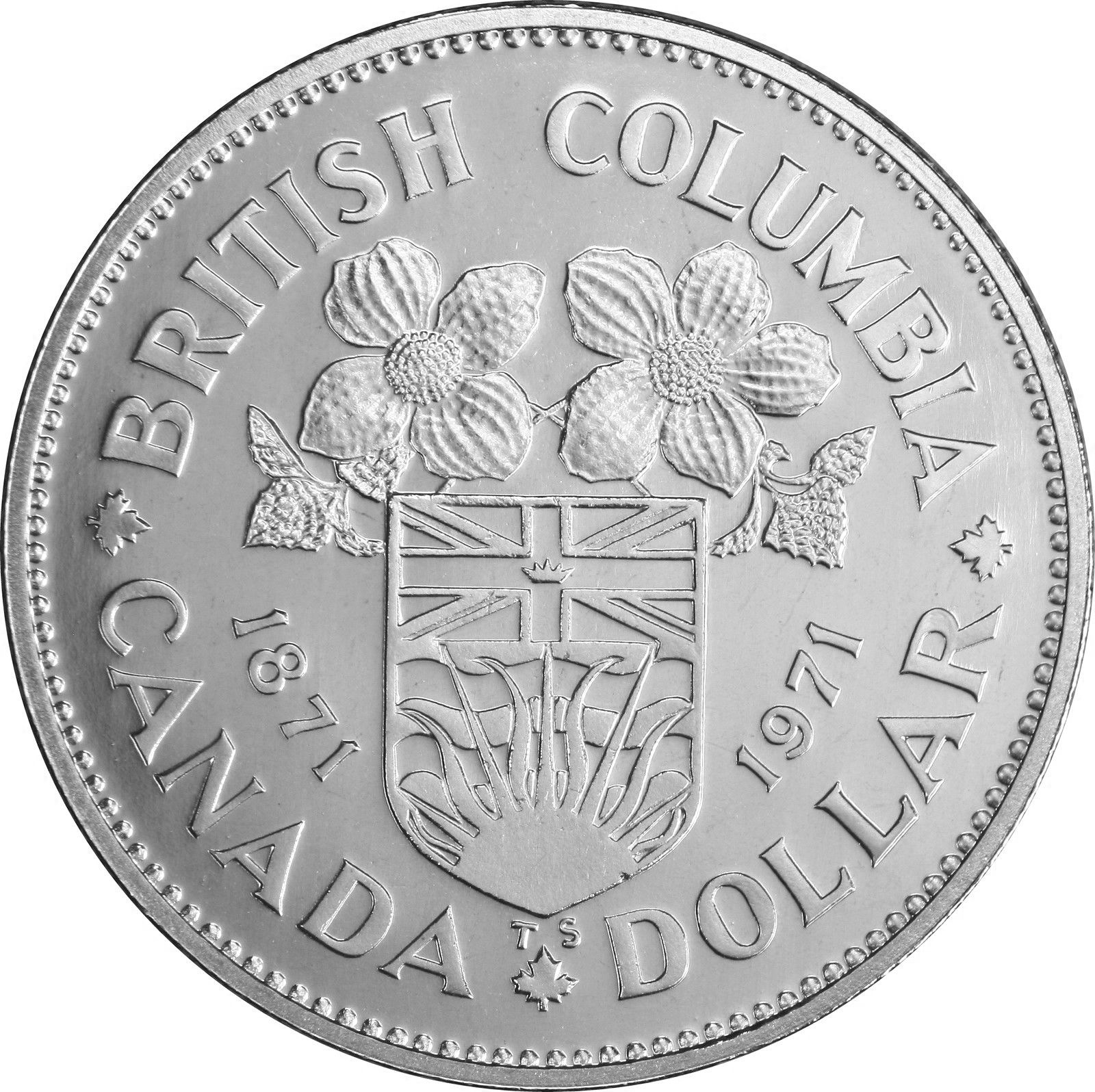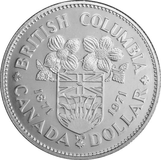British Columbia's centennial Thomas Shingles' design commemorates the centennial of British Columbia's accession to Canada. The coin features British Columbia's coat of arms and its provincial flower, the dogwood. |