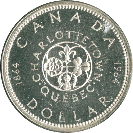 The Confederation meetings Thomas Shingles' design features the French fleur-de-lis, the Irish shamrock, the Scottish thistle, and the English rose. It commemorates the 100th anniversary of the Charlottetown and Quebec City meetings that led to Confederation. |