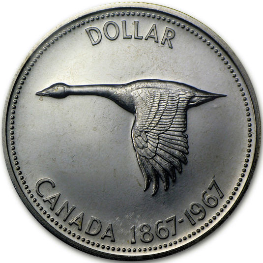 Designed by Alex Coleville. To commemorate the 100th anniversary of Confederation, Alex Colville created a special set of designs for all coin denominations. The one dollar coin features a Canada Goose in flight. At some point in the production process either the reverse die or the obverse die was accidentally rotated in the press, resulting in a "diving goose" variant. This is only determined by viewing the obverse of the coin, rotating it so the obverse is perfectly straight, then flipping the coin over. After 1967, circulation 1-dollar coins were made of nickel until 1987, when the 'loonie' was introduced. |