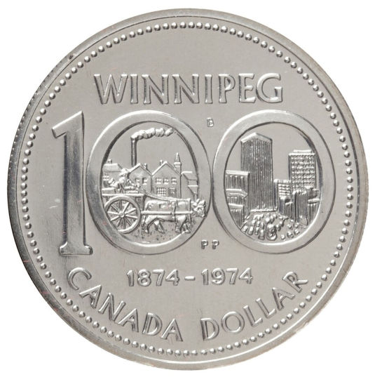 Winnipeg's centennial Patrick Brindley created this design from a drawing by Paul Pederson to commemorate Winnipeg's centennial anniversary. Inside the two zeroes of '"00" are images of Winnipeg's Main street in 1874 (left) and 1974 (right). |