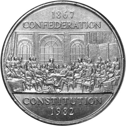The Constitution commemorative coin This design by Ago Ararand and the RCM staff features the famous painting of the Fathers of Confederation along with the inscriptions "Confederation 1867" and "Constitution 1982." |
