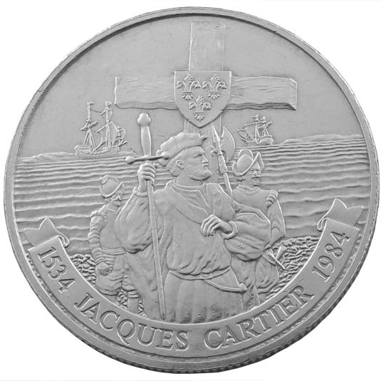 Jacques Cartier on the Gaspe Hector Greville's design of Jacques Cartier and a cross with the French coat of arms commemorates the 450th anniversary of the explorer's landing on the Gaspe Peninsula. |