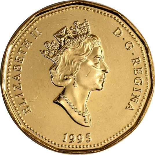 The 1994 National War Memorial and 1995 Peacekeeping coins These special editions use the same obverse designs as the 1990 regular Loon coins, but with the addition of the date below the Queen's effigy. |