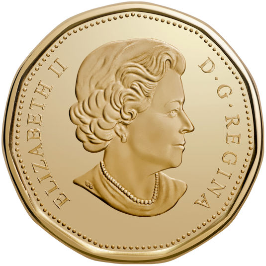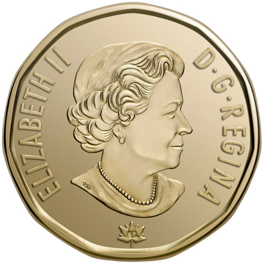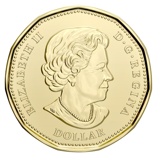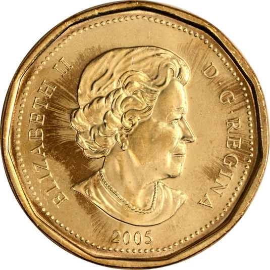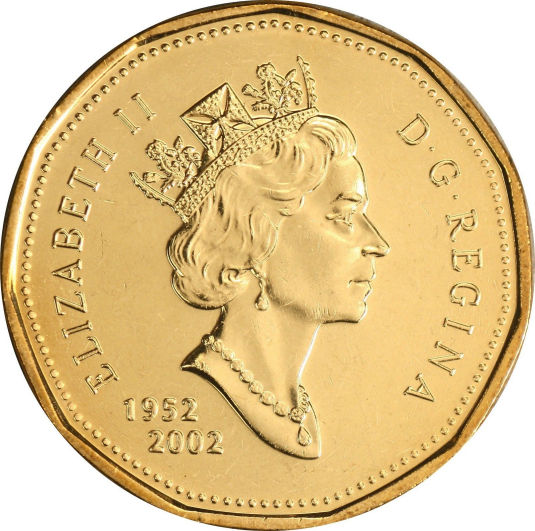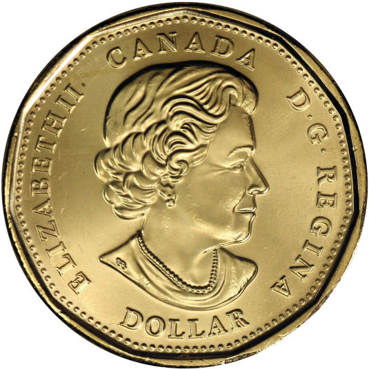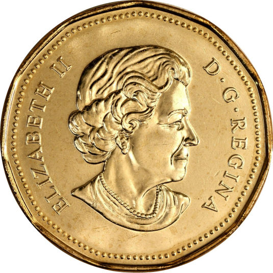 Lower Date This obverse used the same obverse as the 2003 coin, with the date below the Queen's effigy, was used on the following coins: - The Terry Fox coin commemorating the 25th Anniversary of the Marathon of Hope. - The 2010 Vancouver Olympics "Inukshuk" coin. - The 2012-2016 Loon dollar that incorporated new security features on the reverse side - The 2012 Grey Cup 100th Anniversary coin - The 2012 Lucky Loonie - The 2014 Lucky Loonie - The 2022 Celebrating Oscar Peterson |
