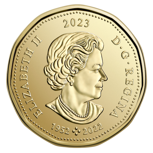The standard Loon and Elsie MacGill commemorative coin releases used an obverse with the year of issue above the Queen's effigy. The Royal Canadian Mint added four pearls below her effigy, symbolizing the four effigies of Her Majesty that have graced Canadian coins since her coronation in 1953. The pearls are flanked by the dates "1952" and "2022" which signify the years she reigned over the United Kingdom. |