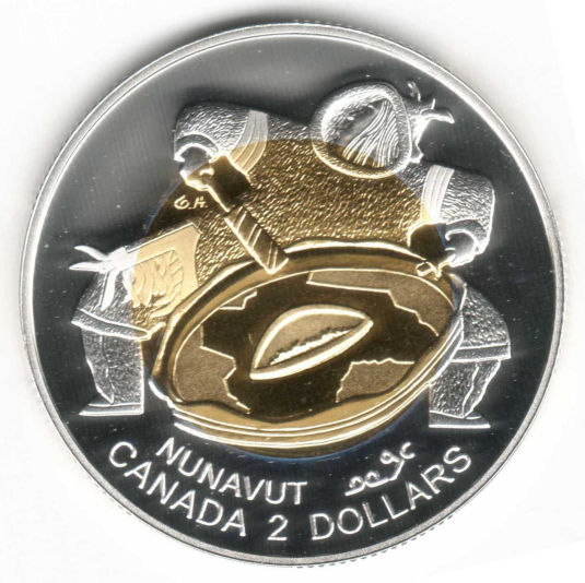 1999 2 dollar circulation coin The Founding of Nunavut (1999) Nunavut First Nations artist Germaine Arnaktauyok and Jose Osio created a special design to commemorate the founding of Nunavut, Canada's newest territory. This design appeared on all 1999 two-dollar coins produced for general circulation. In 1999, the Polar Bear design appeared only in a limited number of special coin sets produced for the collector market. At some point (the beginning?) of the production, the dies designed for the silver and gold version of the this design were used to mint regular circulation coins. In the silver and gold version there is no raised ring between the outer and inner core of the coin. As a result, some uncirculated sets were produced with this "mule" coin |