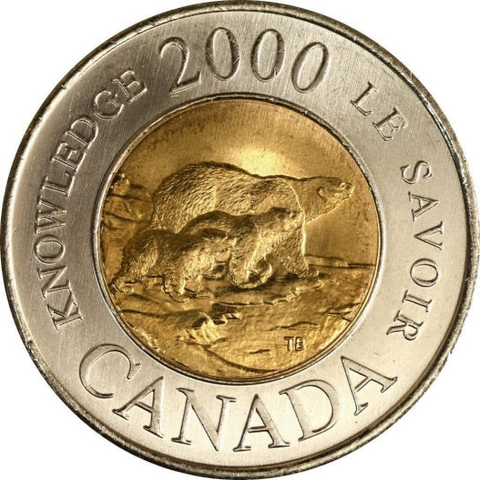 2000 Path of Knowledge 2 dollar circulation coin For the new millennium, artist Tony Bianco illustrated a female polar bear and her two cubs to represent the transfer of knowledge from one generation to the next. The inscription on the coin's outer rim reads "Knowledge - Le Savoir." This was the only "tails" design to appear on the 2000 two-dollar circulation coin. |
