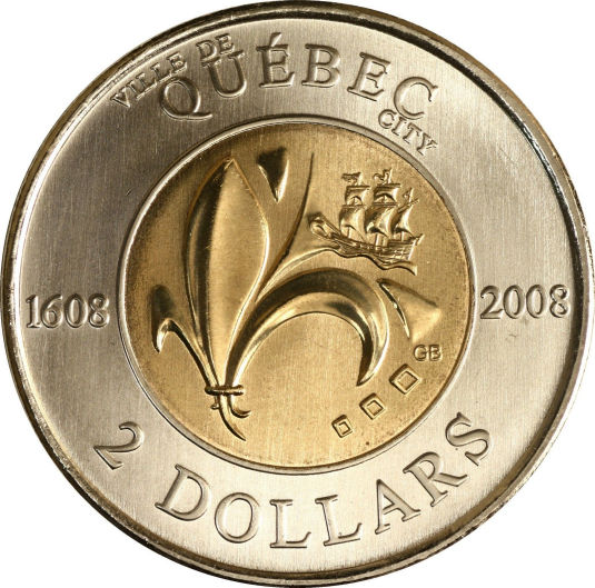 2008 2 dollar circulation coin - 400th Anniversary of the founding of Quebec City Quebec artist Genevieve Bertrand won a design competition to create a new reverse of the two-dollar circulation coin commemorating the 400th anniversary of Quebec City. The date 1608 appeared on the left side of the outer ring, while 2008 appeared on the right of the ring on this commemorative coin's reverse side. Only six million of these special coins circulated, in addition to more than 17 million 2008 Toonies produced with the traditional Polar Bear design. As the date was moved to the reverse side of this commemorative coin, the Mint Mark was moved to the core of the coin on the obverse, to the immediate left of Her Majesty's effigy. |