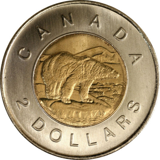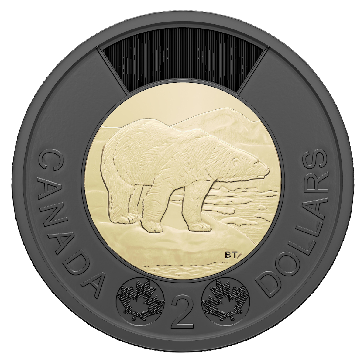 Designed by wildlife and landscape artist Brent Townsend and Ago Aarand, the 2-dollar coin, or 'Toonie', as Canadians have named it, features the image of an adult polar bear in early summer on an ice floe.
