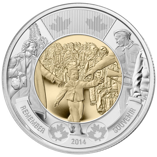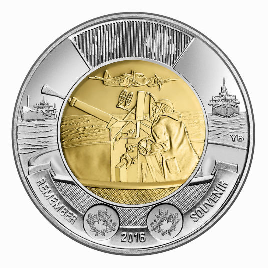 Released in 2016, this 2 dollar coin commemorates the efforts of the Royal Canadian Navy, the Merchant Marine and the RCAF in transporting
