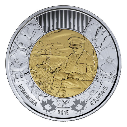 Designed by Glen Loates, the "In Flanders Fields" 2 dollar coin depicts the 100th anniversary of Canadian John McRae's First World War poem, titled "In Flanders Fields". Design: In addition to the standard security features the reverse design depicts John McRae seated next to a war cemetary while writing his legendary poem while a number of birds fly overhead. This image is flanked by a group of poppies on each side. The bottom of the design includes the words "REMEMBER" and "SOUVENIR" flanking the year of issue. |