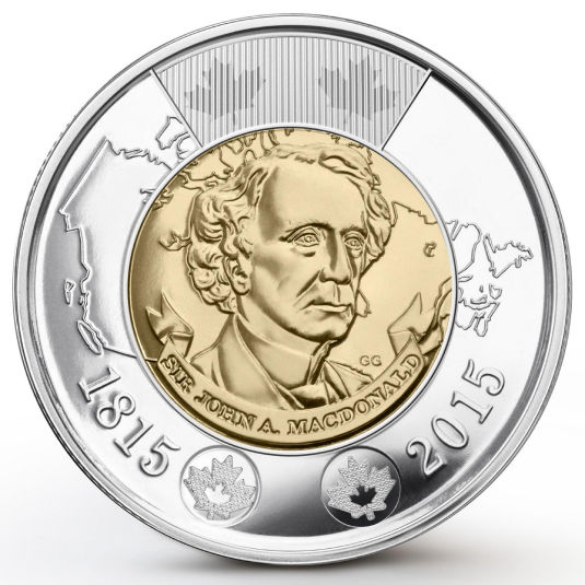 Also released in 2015 was a 2 dollar coin honouring the 200th anniversary of the birth of Sir John A. MacDonald, Canada's first Prime Minister.