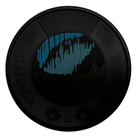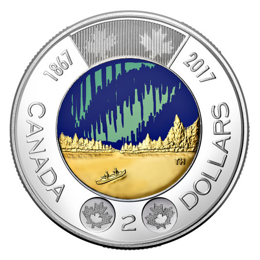 were produced to commemorate the 150th anniversary of Confederation. The Sesquicentennial 2 dollar coin - "Dance of the Spirits" To commemorate the 150th anniversary of Confederation, a design contest was held among all ordinary citizens. The two dollar coin was designed by Timothy Hsia from Richmond, British Columbia . This unique design depicts paddlers gliding across a placid lake under the shimmering curtain of the Northern Lights - which the Cree peoples called "the dance of the spirits". A second coin was released using the same design, but with colour added to the main reverse design elements. The coloured part of the design which depicts the Northern Lights also has an element which glows in the dark - It is a World first that a glow in the dark circulation coin has been produced. |