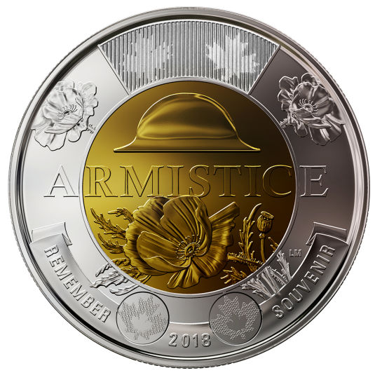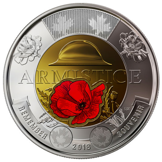 In September of 2018 the Royal Canadian Mint released a pair of commemorative two dollar coins. They commemorate the 100th Anniversary of the end of the First World War (Armistice Day). With two minutes of silence each November 11, Canadians commemorate four years that changed the course of history. It is at the exact moment of Armistice, when the first modern war suddenly came to an end in 1918, that we silently reflect upon that conflict of unprecedented scale, and all who served in a war that was supposed to "end all wars." Design: Designed by Canadian artist Laurie McGaw, the reverse designs mark the 100th anniversary of the Armistice of 1918 with a poignant pairing of two symbols of remembrance. Within the brass-plated inner core, a soldier's helmet represents the end of the First World War and serves as a solemn reminder of the many lives lost during history's first mechanized war. Below the helmet lies a large poppy, the official bloom of remembrance. - In the first version of this coin the poppy's bright scarlet colour is re-created. Two more poppies are engraved on the nickel-plated outer ring, which includes a special-engraved security feature, along with a banner bearing the bilingual words "REMEMBER", "SOUVENIR" and the year "2018". - The second version of this coin is identical to the coloured one with the exception of the main poppy. Instead of being coloured, the poppy's details have been engraved. |