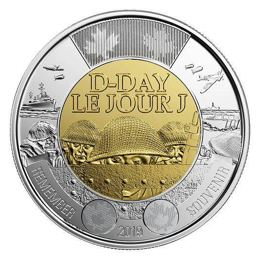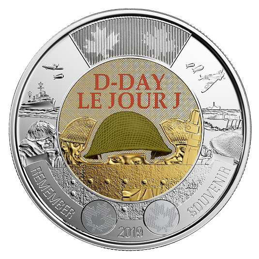 In June of 2019 the Royal Canadian Mint released a pair of commemorative two dollar coins. They commemorate the 75th Anniversary of the D-Day invasion of Normandy, France. What thoughts go through a soldier's mind in the moments before battle? This riveting coin takes you aboard a landing craft where Canadian soldiers are peering over the ramp as they approach the coast of Normandy (France) on D-Day. Their mission: to establish a beachhead at Juno Beach. For months prior, Allied aircraft bombed German installations along the heavily defended coast in preparation for the arrival of a massive invasion force - 150,000 Allied troops that came ashore on June 6, 1944. Among them, 14,000 Canadians who secured their beachhead (Juno) before moving to capture German positions further inland. On D-Day alone, 359 Canadians lost their lives, and by the time Paris was liberated on August 25th, more than 5,000 Canadians had made the ultimate sacrifice to regain critical ground for the Allies in Western Europe. Design: This coin designed by Canadian artist Alan Daniel is charged with tense anticipation as Canadian soldiers peer from their landing craft en route to Juno Beach. This compelling landing craft perspective extends beyond the inner core to the outer ring where naval and air forces support the Allied landings. - In the first version of this coin the soldier's helmet is shown in full colour while the "D-DAY/LE JOUR J" text above the helmet is printed in a vibrant red colour. - In the second version of this coin the soldier's helmet as well as the "D-DAY/LE JOUR J" text above the helmet are engraved, while the rest of the coin is identical to the coloured version. |