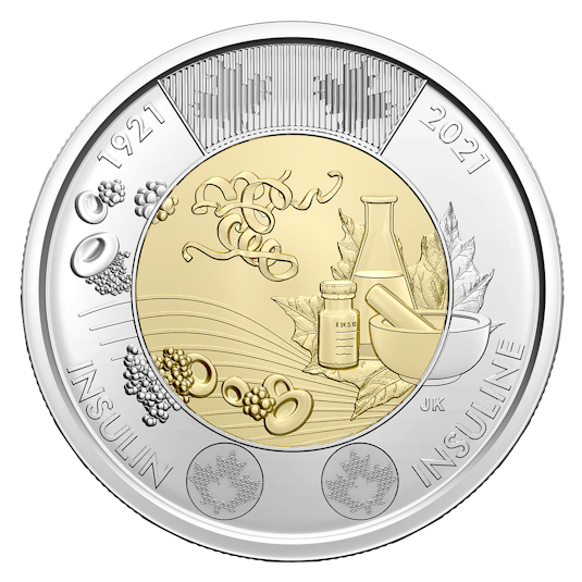 In 2021 the Royal Canadian Mint released a pair of commemorative two dollar coins. They celebrate the 100th Anniversary of the discovery of insulin.