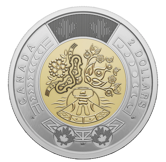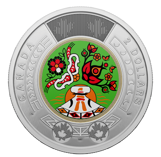 Design: The 2023 commemorative $2 circulation coin combines the art of the following artists, whose joint creation stunningly combines their expressions of First Nations, Inuit, and Metis cultures, art and traditions and is an open invitation to celebrate National Indigenous Peoples Day:
