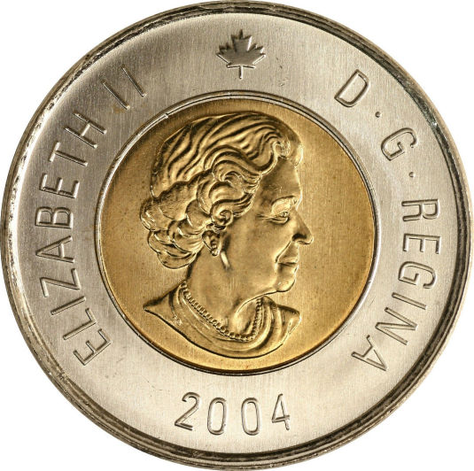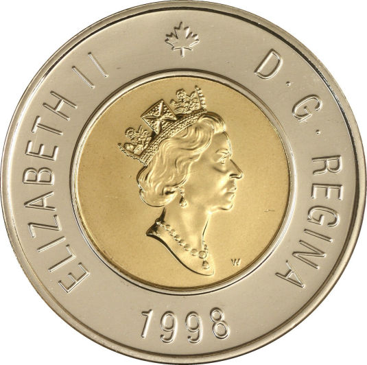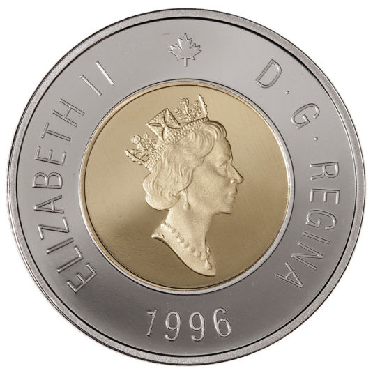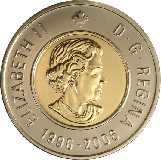 manufactured for general circulation as legal tender. The 2-dollar coin was first introduced on February 19, 1996, to replace the 2-dollar bill. The 'Toonie' has a life span approximately 20 times longer than paper currency and is manufactured using a distinctive bi-metallic coin locking mechanism patented by the Royal Canadian Mint While many versions of the outer ring exist, only two versions of the core have ever been made: The "Crowned" or Diademed Queen (1990-2003) and the "Mature" Queen (2003-present). NOTE: Click on any photo to load a much larger version of the same photo |