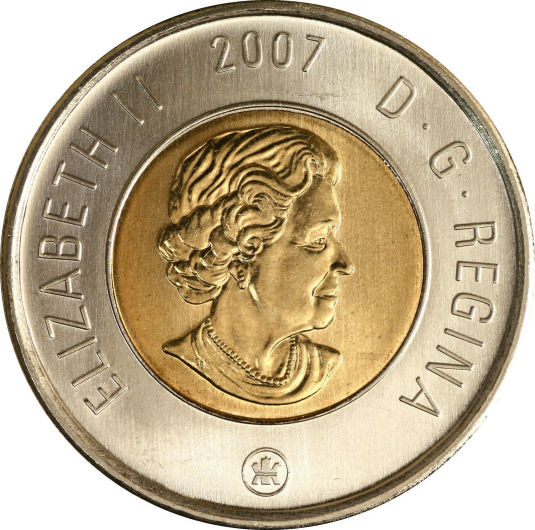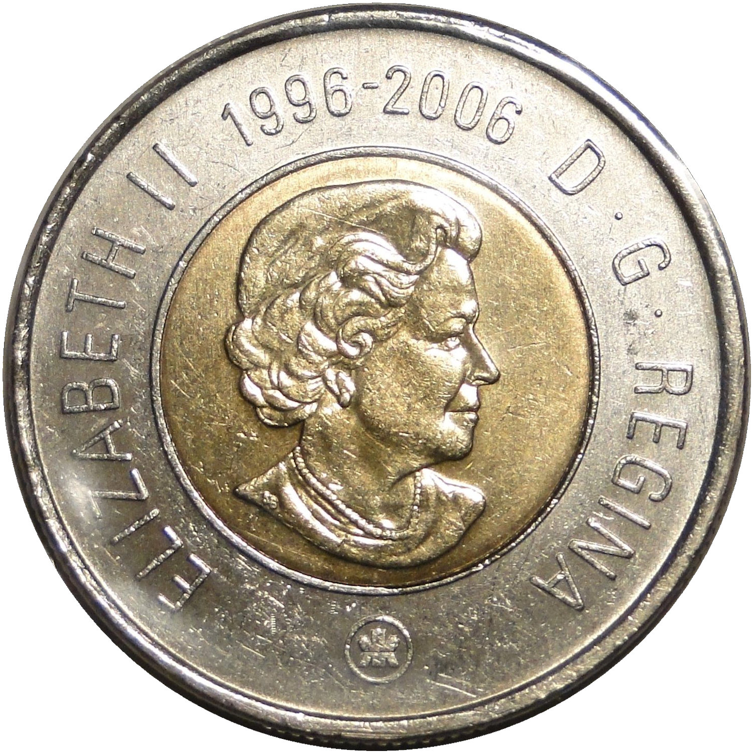 Two new coins for the 10th Anniversary of the two-dollar circulation coin (2006) In celebration of the 10th anniversary of its introduction, the two-dollar circulation coin was produced in two versions: - The first honouring the traditional Polar Bear design of artist Brent Townsend. - The second featuring his updated pose of the bear looking up at the dramatic lines of an Aurora Borealis, designed by Tony Bianco and Steve Witten. It is important to note the position of 1996-2006 double date on each coin: the traditional bear design shows the date beneath the effigy of Her Majesty, while the updated bear shows the date above the effigy. In 2006, the Mint also introduced the Mint Mark on the obverse side of all Canadian circulation coinage. The Mint Mark encompasses the three elements of the Mint's corporate name: M for Mint; a Maple leaf for Canada; and a crown for Royal and Crown Corporation. It features the Mint design within a circle and consists of a symbol depicting a stylized maple leaf emerging from the letter M.