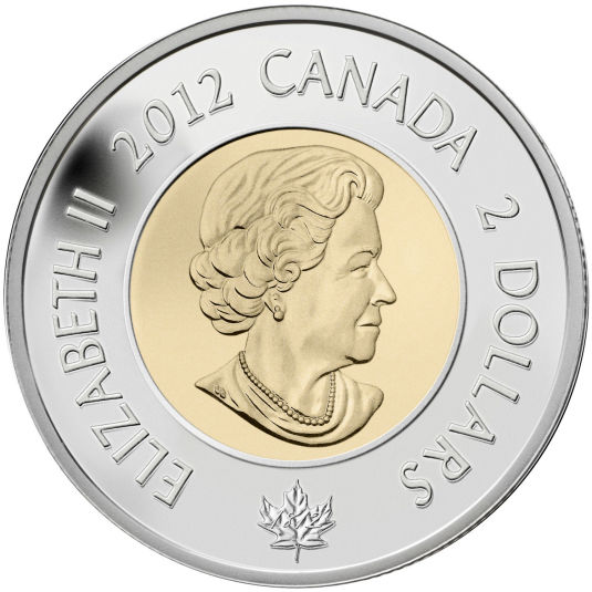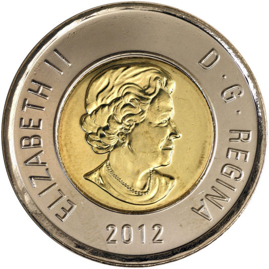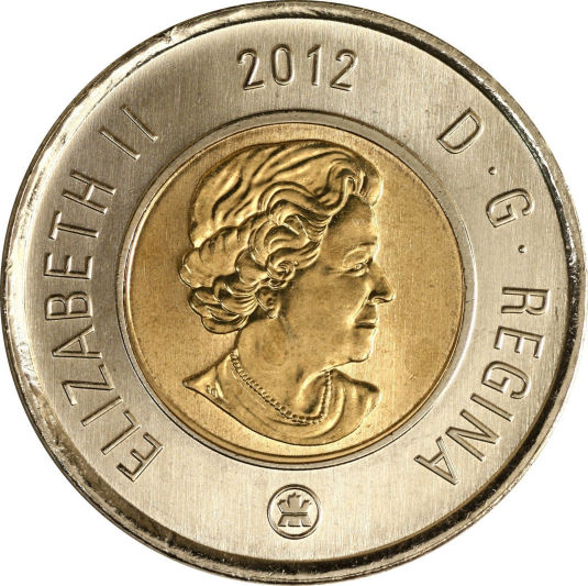 During the 2012 production year a radical design change was made to increase security and combat couterfeiting. While the new two-dollar coin maintains the traditional Queen Elizabeth II obverse design, there are two changes to the obverse: - The date was moved to the bottom. - The Mint logo was removed to make room for the date. - Edge-lettering of the words "CANADA" and "2 DOLLARS" are engraved along the coin's outer edge. The edge lettering which was introduced along with the new security features is stamped into each coin by a separate press, so there is no way to control which side faces up as each coin enters the press. As a result there are two varieties of each coin. - With the Type A edge the edge lettering is right side up when the obverse is showing: - With the Type B edge the edge lettering is right side up when the reverse is showing: |