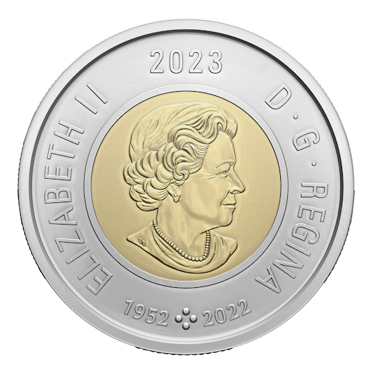 After the death of Queen Elizabeth II on September 8 2022, the Royal Canadian Mint changed the obverses of all 2023 coins. They added four pearls below her effigy, symbolizing the four effigies of Her Majesty that have graced Canadian coins since her coronation in 1953. The pearls are flanked by the dates "1952" and "2022" which signify the years she reigned over the United Kingdom. |