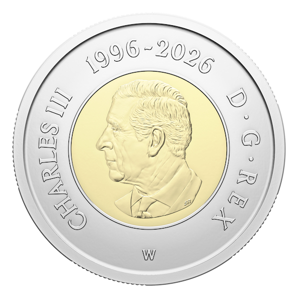 While the reverse on these coins contain the standard "Polar Bear" design, the obverse contains the double date of "1996-2026" above the King's effigy. The obverse also bears the "W" mint mark indicating it was proudly struck at their Winnipeg facility, which turns 50 in 2026. That "W" serves as a double celebration - for the Toonie that has only ever been minted in Winnipeg, and for the facility that has produced all of Canada's circulation coinage since 1976. The obverse features the effigy of His Majesty King Charles III by Canadian artist Steven Rosati. |