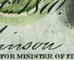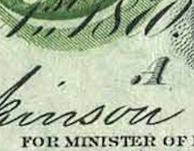 A third manuscript signature was added vertically near the left or right end of the face either in Ottawa or at the office of the various Assistant Receivers General.